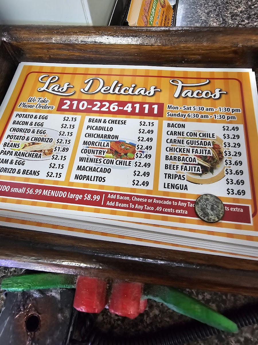 Welcome to Las Delicias Tacos #1, a vibrant eatery located at 1603 W Commerce St #100, San Antonio, TX. Known for its warm atmosphere and friendly service, this cafeteria-style restaurant serves a delightful array of authentic Mexican dishes. Your taste buds will be tantalized by their Stew Chicken and Stew Oxtails specials, available for just $6.00 and $7.00, respectively. Don’t miss the Steak Sandwich or the unique Jibarito Plantain Ham Sandwich. For those craving something soupy, the Souppy Shrimp is a must-try at $14.95.